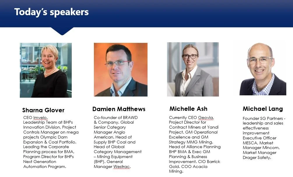 “I attended the Excellence in Mining panel session today with our account management team. It was a peak behind the curtain of what senior executives in mining are looking for when choosing their partners. The amazingly qualified panel had a diversity of views from both sides of the sales divide - COO, Program Directors, Supply Chain Managers to name a few roles they have held in some big mining companies. The information they shared will be invaluable for us to check in on how we are pitching our business in this important sector and beyond. I would highly recommend accessing the recording and attending future sessions with your team.”